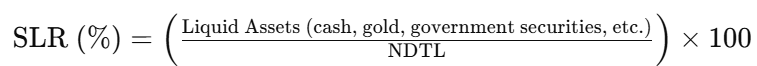 - Maintaining Liquidity: By requiring banks to hold a specified percentage of their net demand and time liabilities (NDTL) in liquid assets, the SLR ensures banks have sufficient funds to meet sudden withdrawal demands or emergencies.