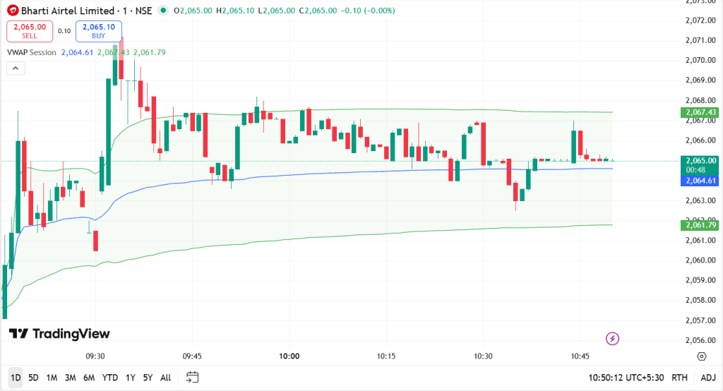 The chart below shows Bharti Airtel’s 1-day in 1-minute interval price movement, on 12 November 2025, with the Volume Weighted Average Price (VWAP) indicator.